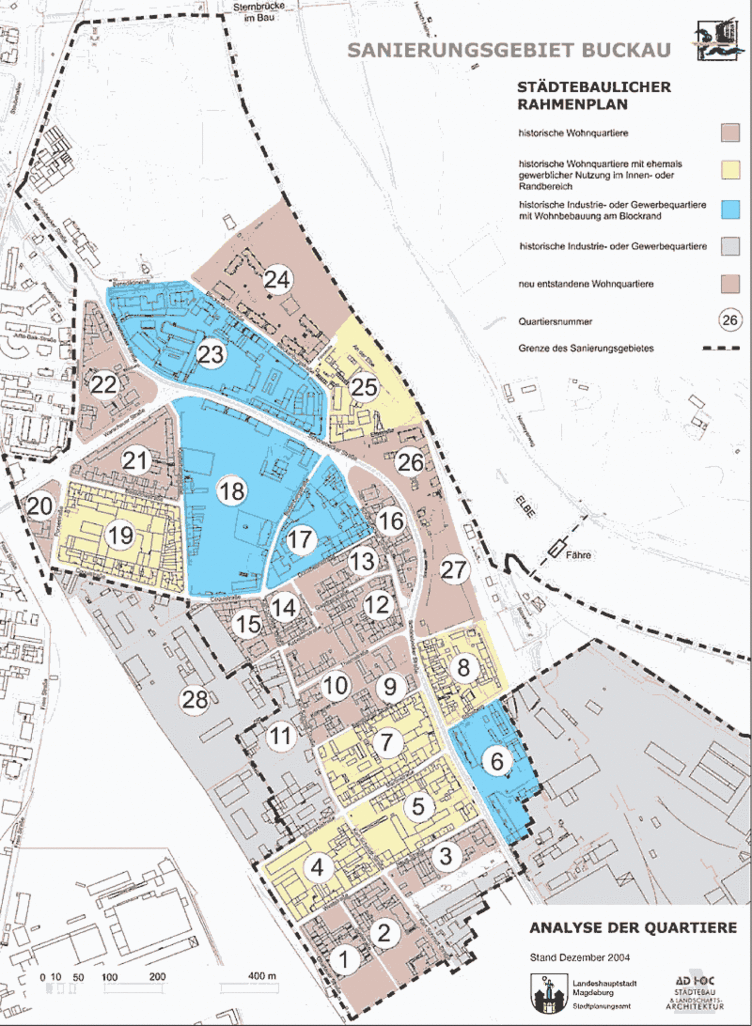 Ein über Jahrzehnte vernachlässigter Stadtteil wurde für die nächsten 30 Jahre in den Fokus der Stadtentwicklung gelegt. Diesen langen Zeitraum konnte man damals bestenfalls erahnen und das heutige Ergebnis des Prozesses erhoffen. Der städtebauliche Rahmenplan von 1993 konstatierte für das Sanierungsgebiet einen Leerstand von 38% der 614 Gebäude bzw. von rund 1.000 Wohnungen. 81% der Gebäude bzw. 2.859 Wohnungen waren sanierungsbedürftig. 55% der Gebäude waren in einem schlechten Zustand und verteilten sich gleichmäßig über das gesamte Sanierungsgebiet. Diese Zahlen verdeutlichen die kolossal große Aufgabe, der sich die Stadt stellte. Und die Rahmenbedingungen waren nicht unbedingt beflügelnd. Magdeburg war insbesondere in den 1990er Jahren und bis ins Jahr 2004 von Bevölkerungsverlusten geprägt. Eine große Zahl an Arbeitsplätzen auch im näheren Umfeld Buckaus war weggebrochen.
