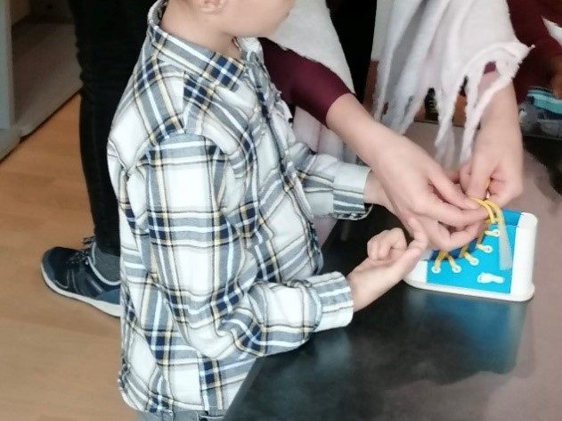 „Fit für die Schule“-Parcours der aufzeigte, wo Ressourcen liegen und Bedarfe bestehen. Sie bekamen Handlungsstrategien verschriftlicht und in Form von Rückmeldung durch die Sozialarbeiterinnen an die Hand. Bei Fragen zu: Wie loche ich ein Blatt? Wie hefte ich ein Blatt ein? Wie binde ich einen Schnürsenkel?... konnten die Eltern ihre Kinder unterstützen und sahen gleichzeitig, was ihre Kinder noch lernen sollten, bevor es heißt: Tschüss Kindergarten! Hallo Schule!