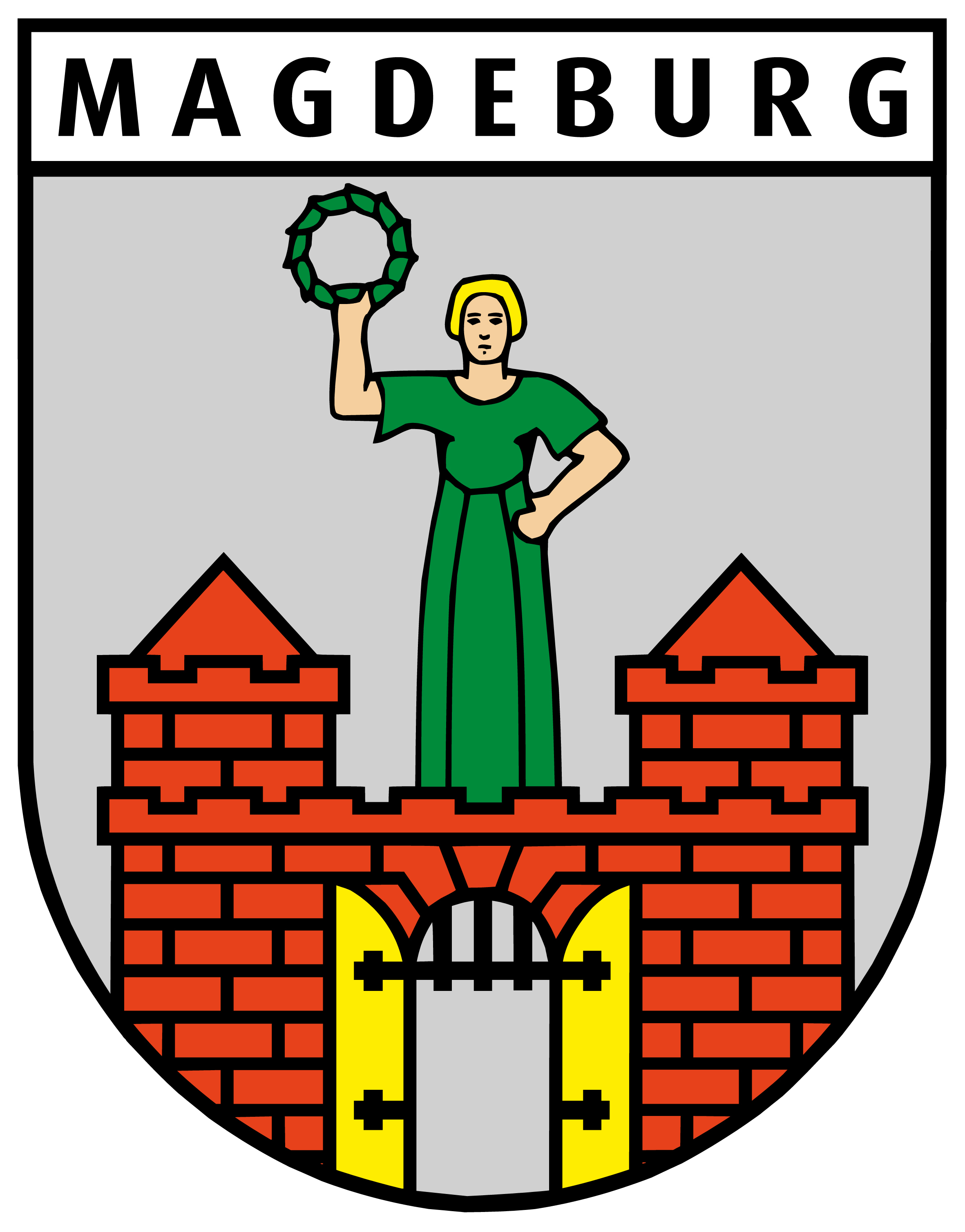 Das Magdeburger Stadtwappen zeigt in Silber eine gezinnte rote, schwarz gefugte Burg mit zwei spitzbedachten Türmen, geöffnetem goldenen Tor und hochgezogenem schwarzen Fallgatter; zwischen den Türmen wachsend eine grün bekleidete Jungfrau (Magd), in der erhobenen Rechten einen grünen Kranz empor haltend.