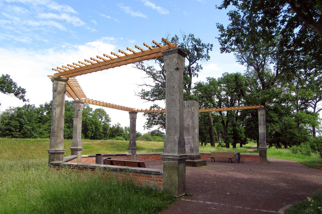 Neben den Steinelementen wurde auch die hölzerne Pergola wiederaufgebaut. Diese wird künftig durch rankende Pflanzen begrünt. Darüber hinaus wurden die neuen steinernen Bauelemente in Abstimmung mit dem Denkmalschutz ihrem historischen Vorbild farblich angepasst.