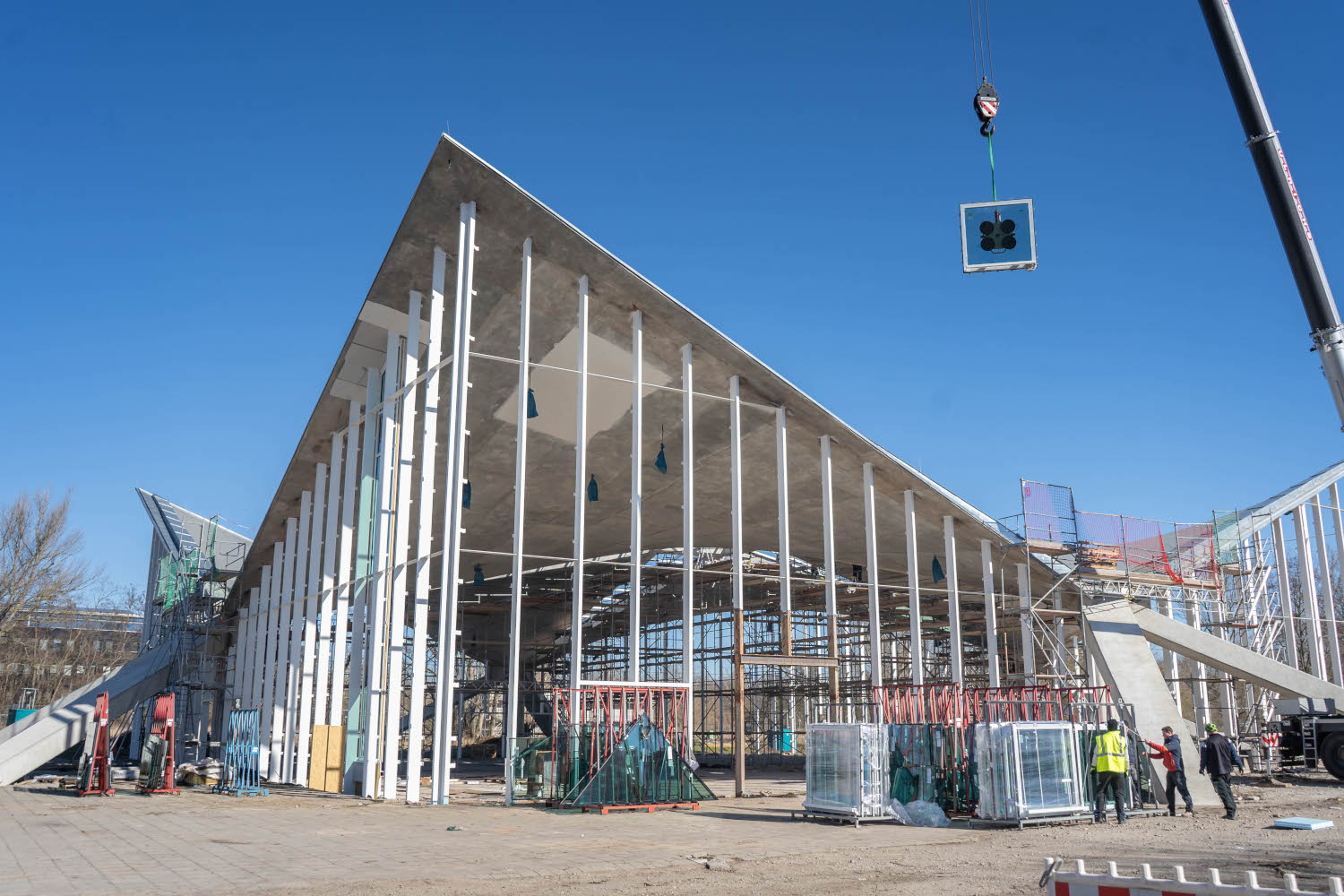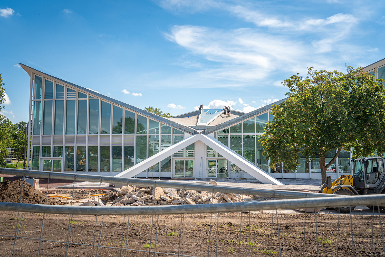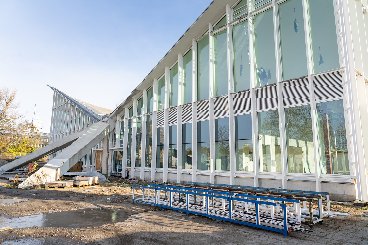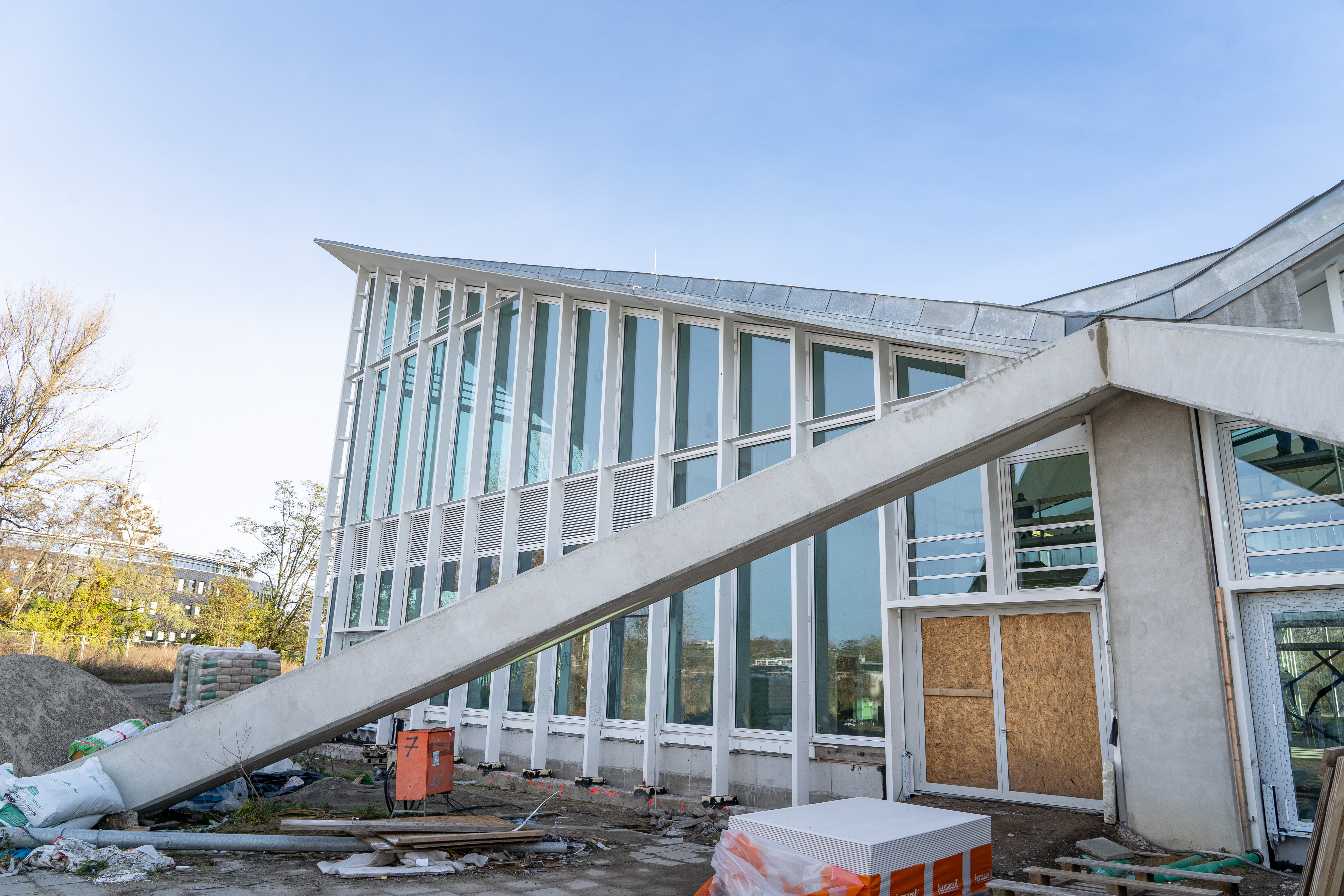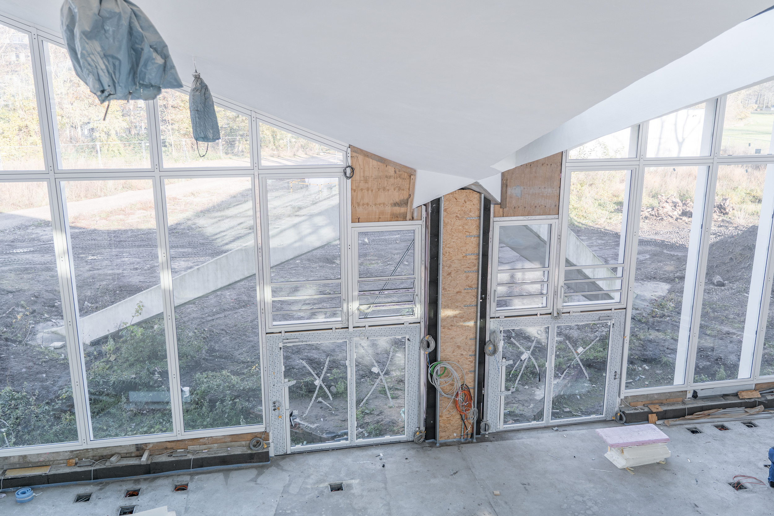 Einbau der Glaselemente für das Lichtband im Dach im März 2022